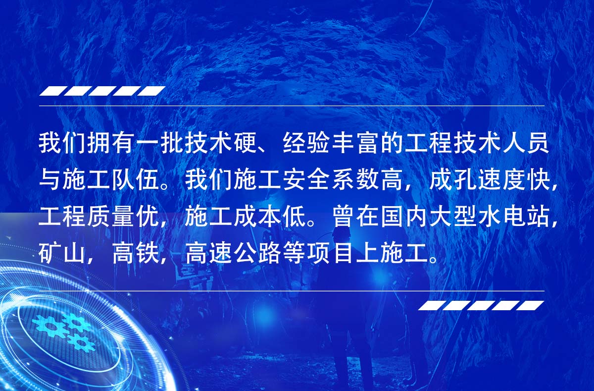 淮北市勤拓礦山工程有限公司是一家從事多年反井鉆機(jī)施工的服務(wù)生產(chǎn)型公司,公司目前有十幾臺(tái)鉆機(jī)設(shè)備,ZFY120/30/150型反井(天井)鉆機(jī)5臺(tái),ZFY1.8/40/250型反井(天井)鉆機(jī)4臺(tái),ZFY2.5/70/200型反井(天井)鉆機(jī)2臺(tái),ZFY3.0/120/400型反井鉆機(jī)1臺(tái),ZFY3.5/120/400型反井(天井)鉆機(jī)1臺(tái),可承接深度0-300米,成孔直,0.9~4米.1.2~3米的各種豎井、井下煤倉、溜煤眼、通風(fēng)井、調(diào)壓井、電纜井、泄水井等。我們擁有一批技術(shù)硬、經(jīng)驗(yàn)豐富的工程技術(shù)人員與施工隊(duì)伍。我們施工安全系數(shù)高,成孔速度快,工程質(zhì)量?jī)?yōu),施工成本低。曾在國內(nèi)大型水電站,礦山,高鐵,高速公路等項(xiàng)目上施工。